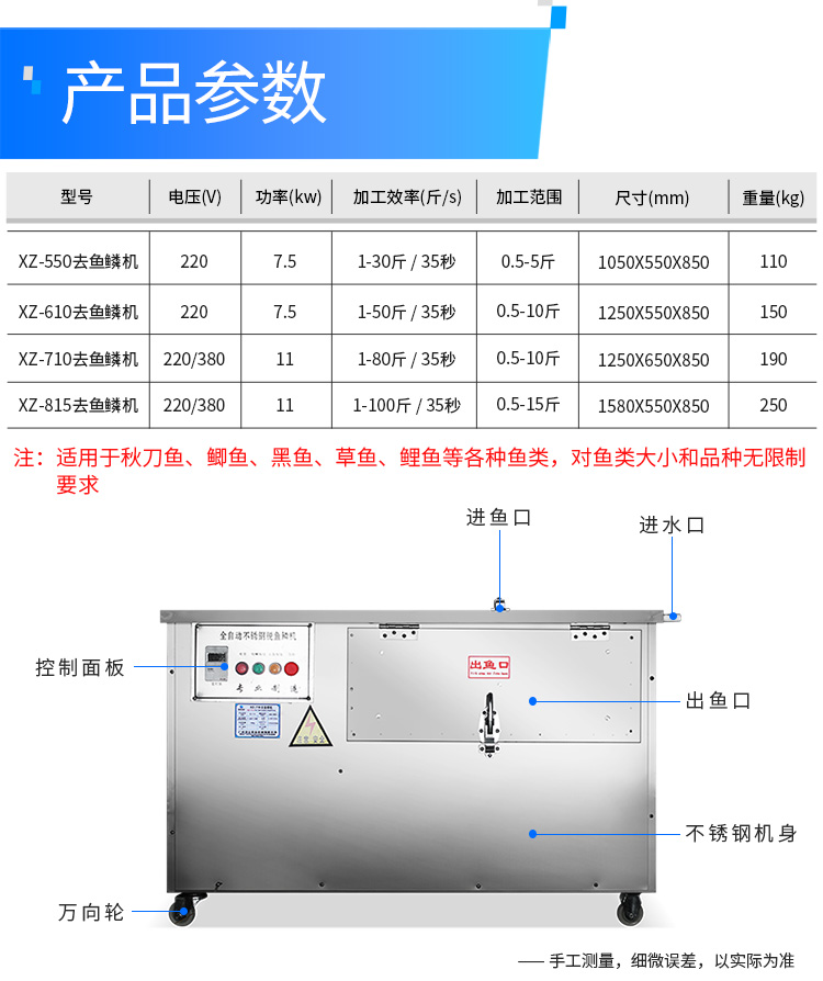 | 型號(hào) | XZ-550去魚鱗機(jī) | XZ-610去魚鱗機(jī) | XZ-710去魚鱗機(jī) | XZ-815去魚鱗機(jī) |